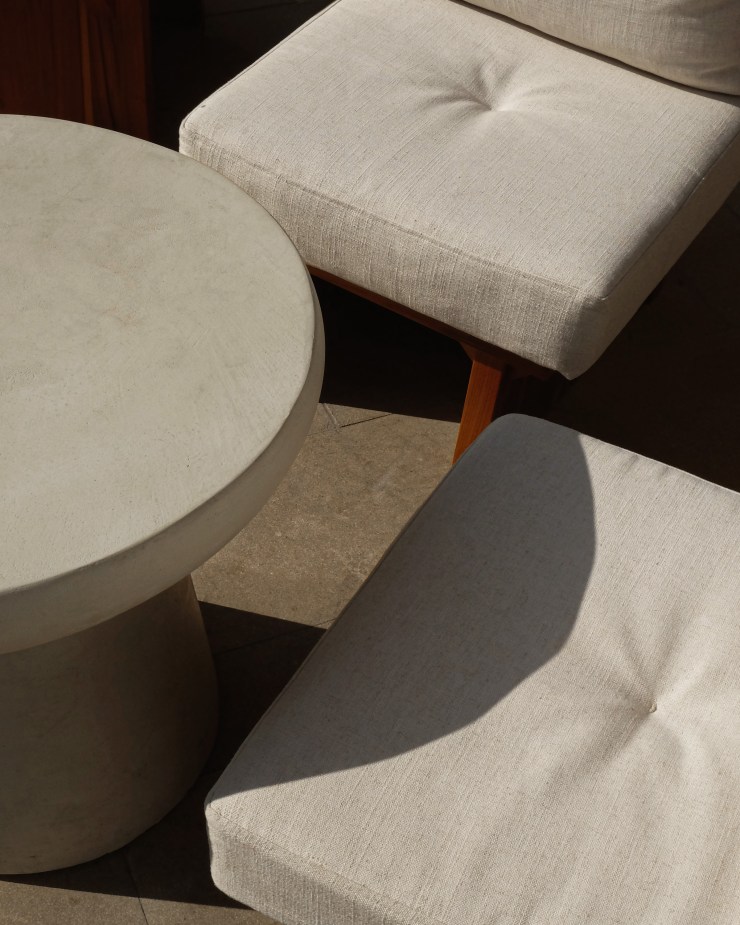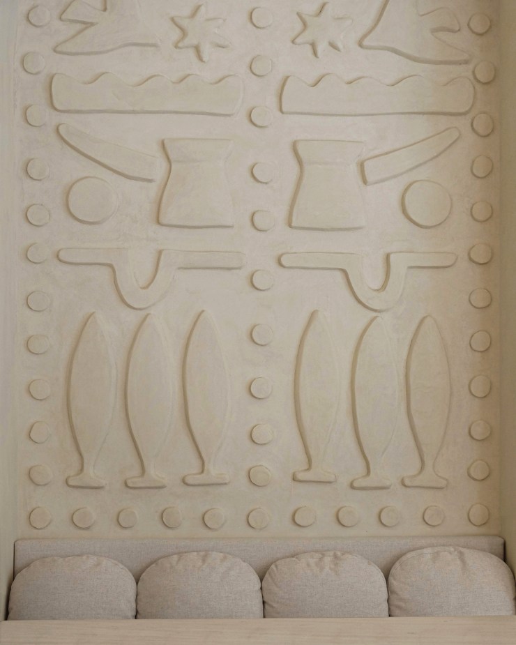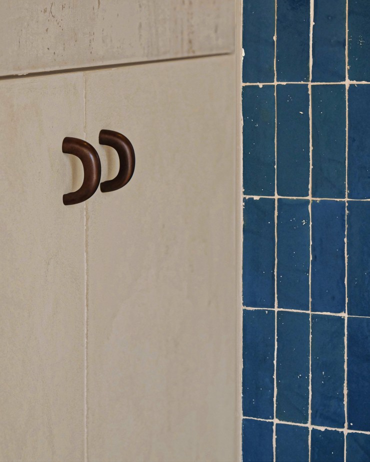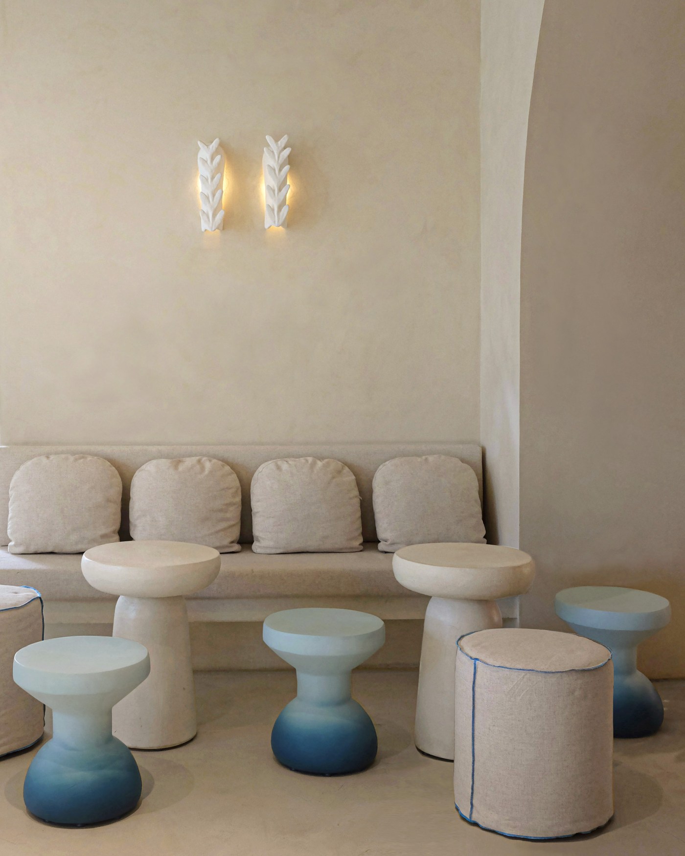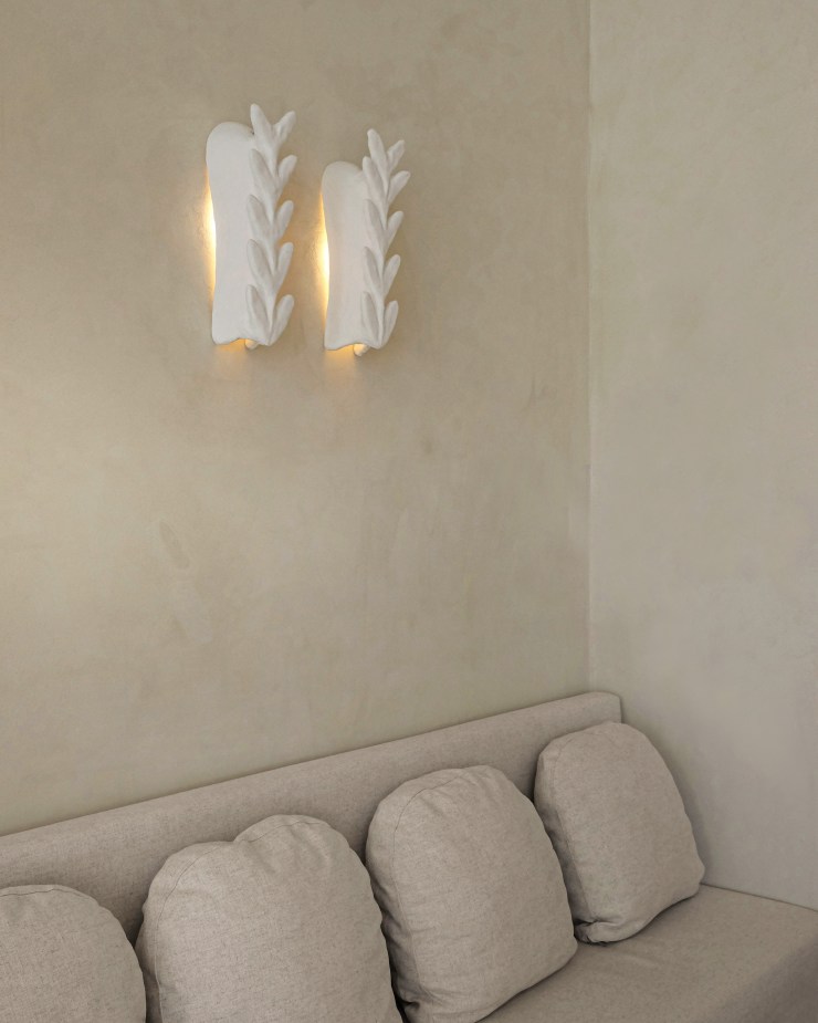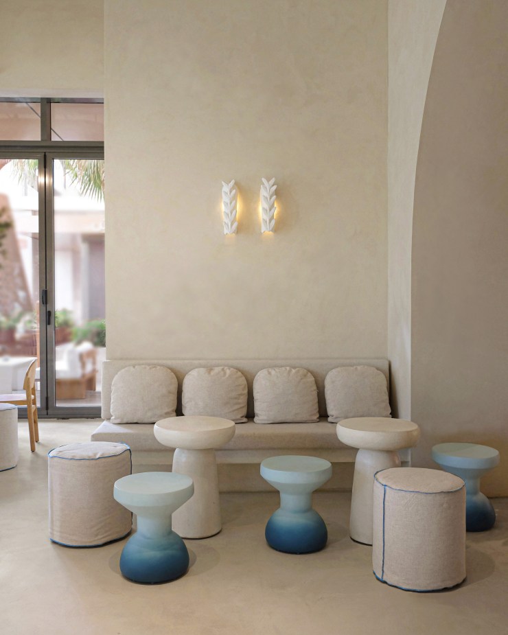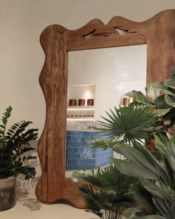 Sculptural lights in Ben Rahim are crafted in Tunisia from local materials such as clay and sea rush. The oversized palm wood mirror, also crafted in Tunisia, brings in a warm and earthy feel, complementing all the natural materials and textures throughout the space.