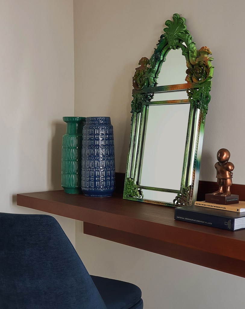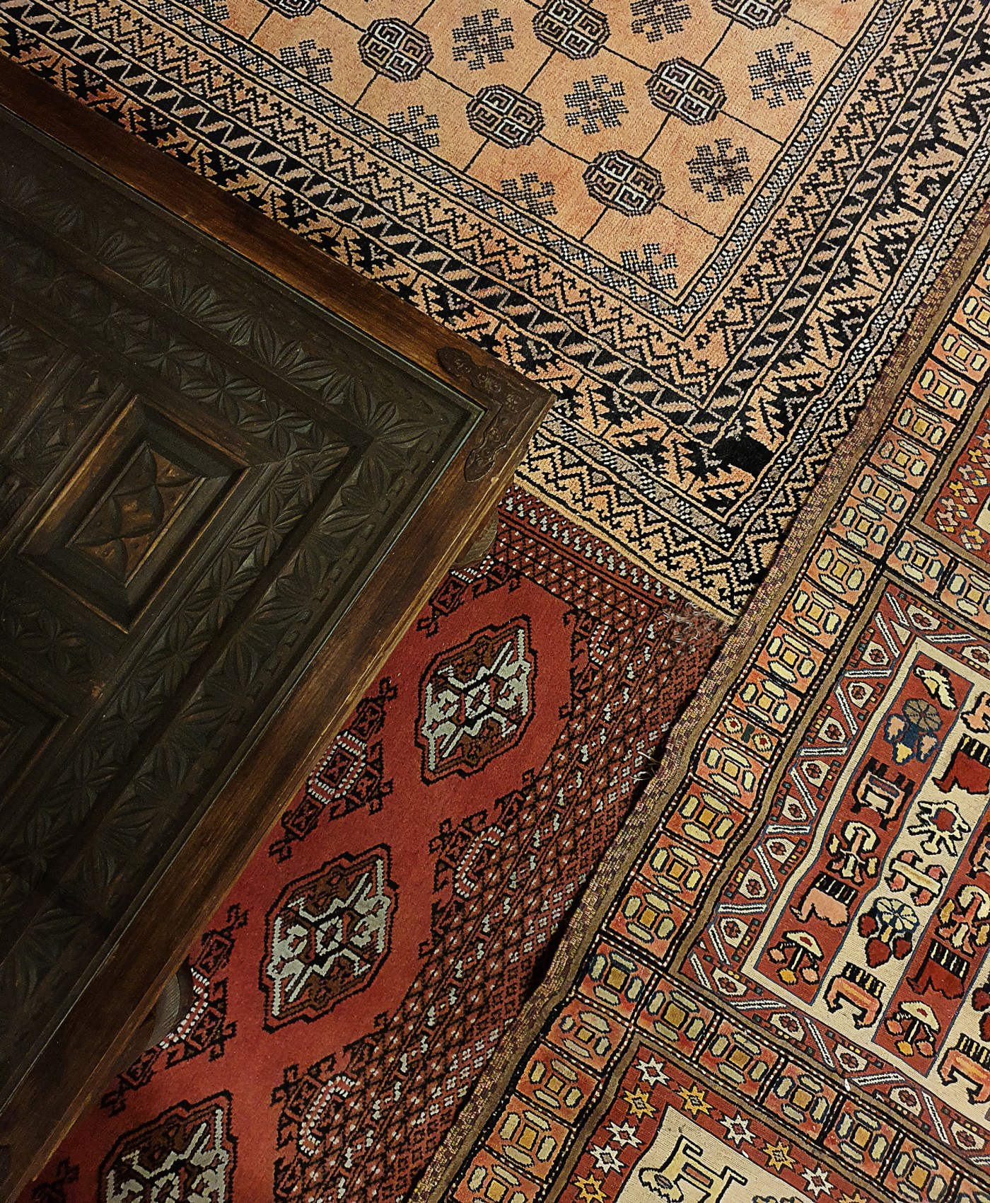 Apartment refurbishment in Pearl, Qatar. The apartment is meant for rental purpose, the aim was to create a personal and locally relevant environment. A mix of contemporary and traditional furniture, tribal carpets from Central Asia and Iran, objects, and art from the region. The terrace overlooking Persian Gulf coast waters is created with a feeling of traditional Qatari outdoors spaces.