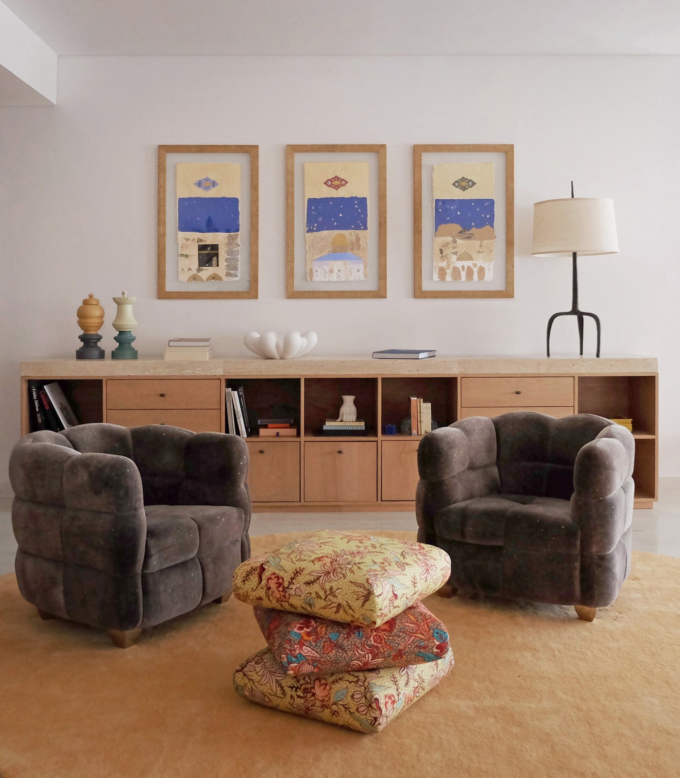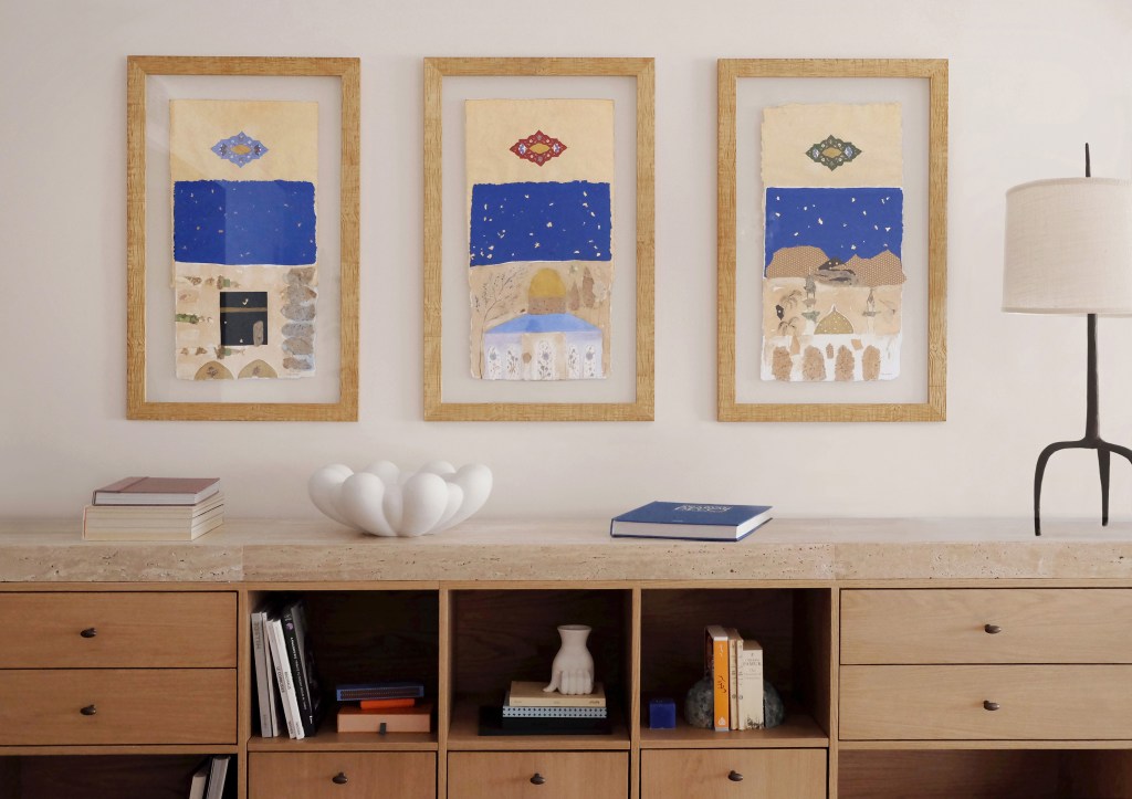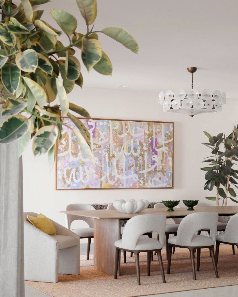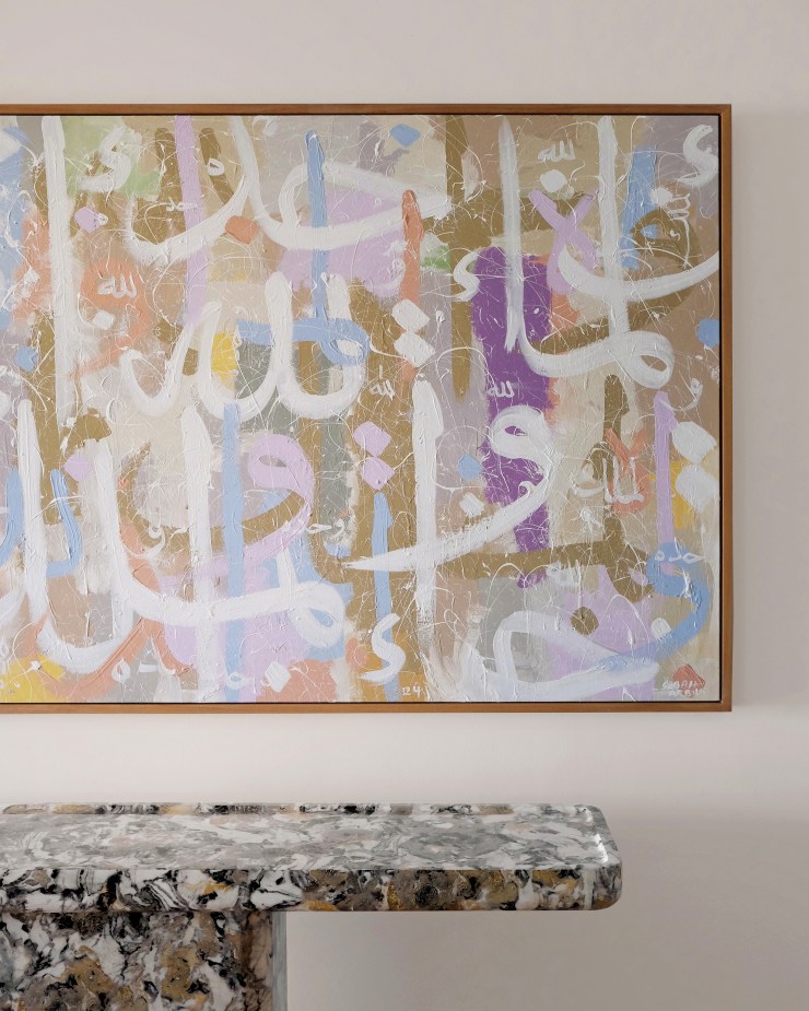 Artworks chosen for this space have a personal meaning for the clients – a conversation between contemporary calligraphy and Islamic miniature paintings.