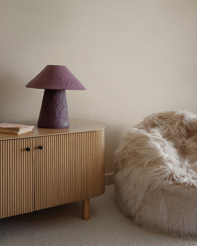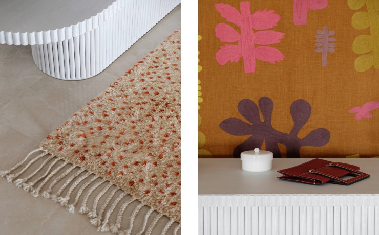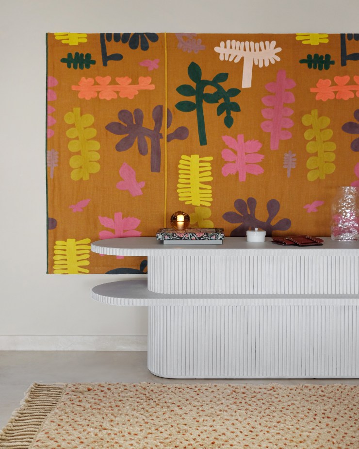 The entrance area forms a part of the large living space. It is dressed up in a mix of textiles, and the protagonist is the wall hanging – embroidered fabric from Pierre Frey. A terracotta-spotted Beni rug adds softness and a welcoming touch to the arrival home.