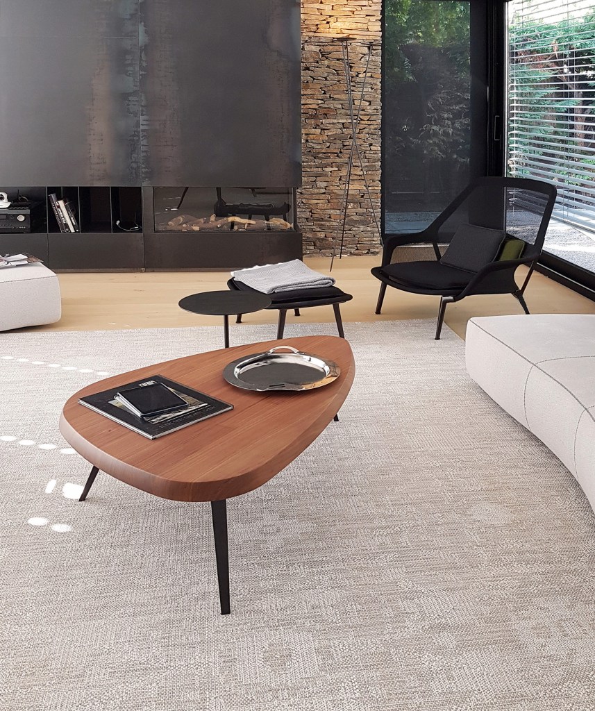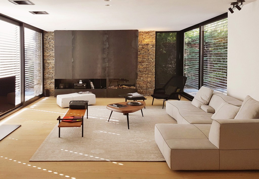 Carefully chosen contrast in materials is creating warm and contemporary look – black metal details against warmth of the wood, textiles with delicate texture like fading ornaments or decorative stitches. Calm but alive colours of natural wood, various shades of grey and deep black as accent color. In this house visual aspect and location of lights play as important role as furniture. Every piece speaks for itself while all together creating a unified ambient.