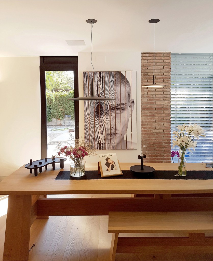 Interior furnishing for a family house outskirts of Barcelona that disclose entirely the soul of proprietor. Every piece is chosen with a purpose, is it a furniture, light or decorative object. Contemporary furniture are mixed with iconic pieces – in order to create functional living place for a family of 4 and in the same time a space with character. The heart of the house is a dining area where family and friends are gathering around the huge solid wood dining table, visually connected to living area.