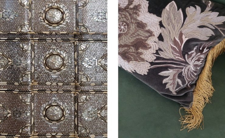 Majlis with several seating areas, mix match of styles, colors and materials creates a unique environment. Bespoke modern items juxtaposed to antique or new traditional Syrian furniture. Carpets from Iranian masters play an important role in these representative areas of the house.