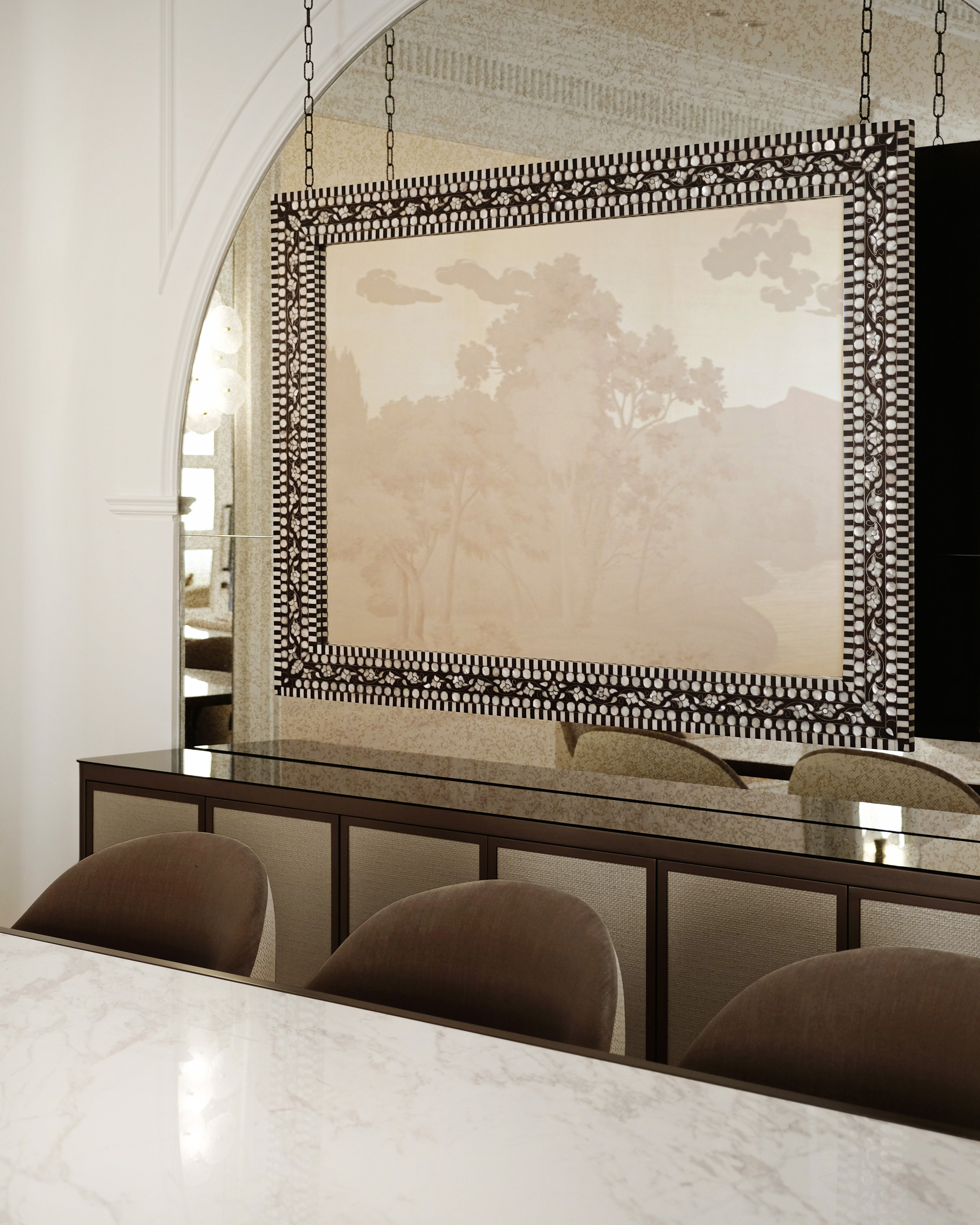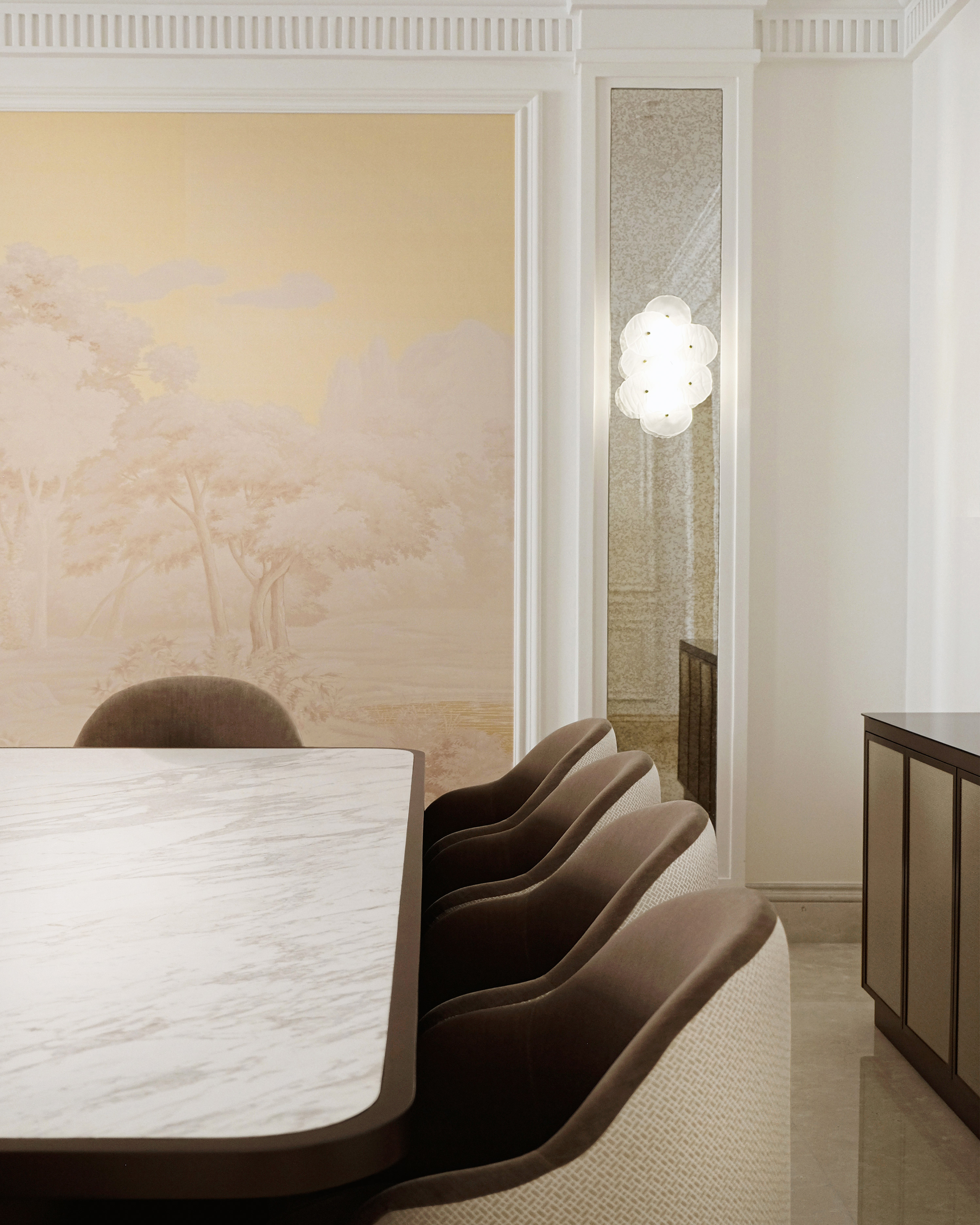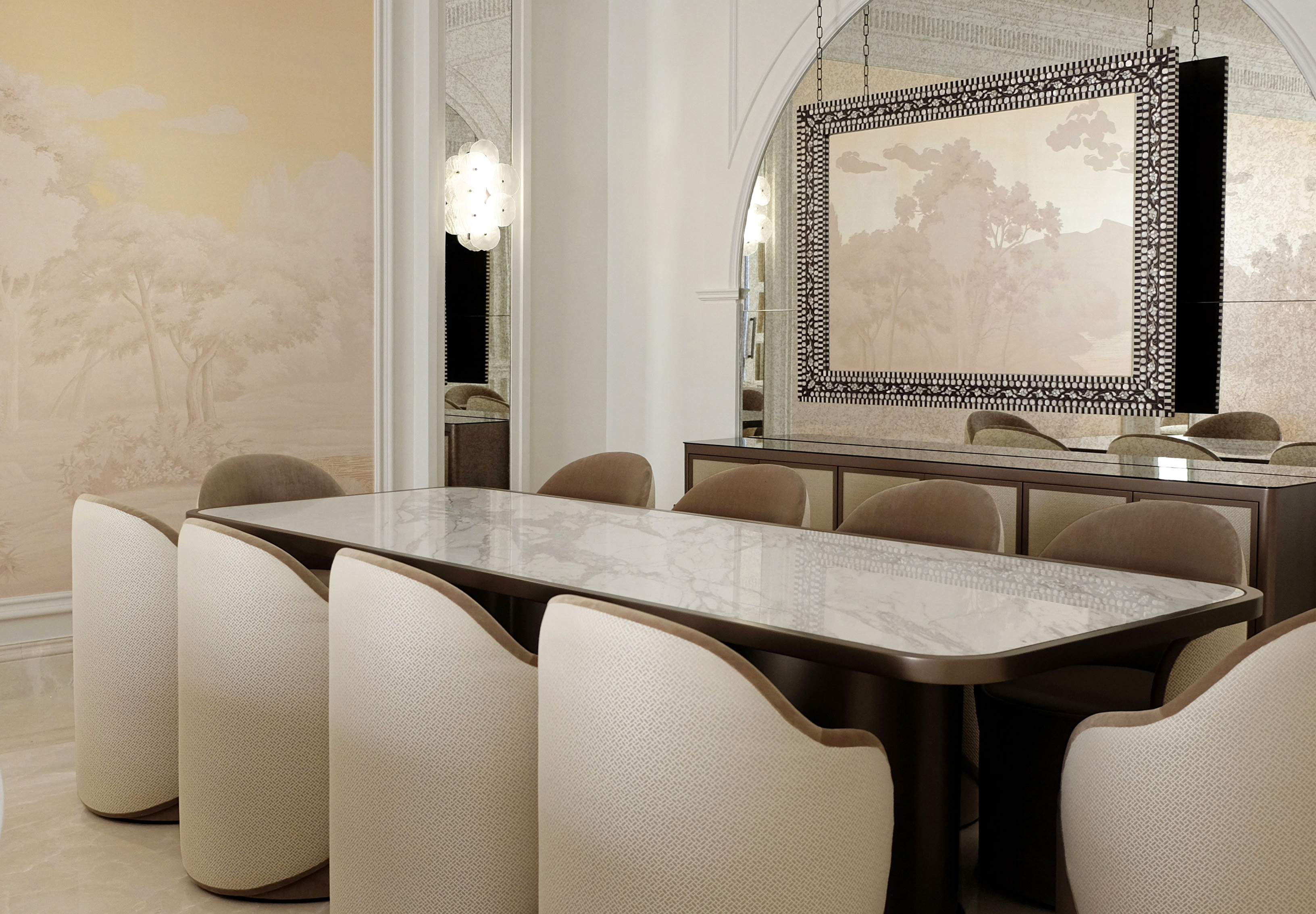 A majlis that harmoniously blends classic and modern elements, with its seating and dining area staged against the backdrop of a historic landscape by Fromental. Soft, elegant color palette and subtle patterns create a tranquil space where to enjoy gatherings.