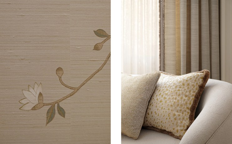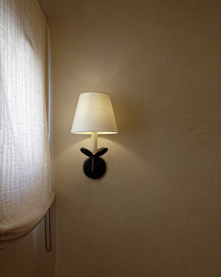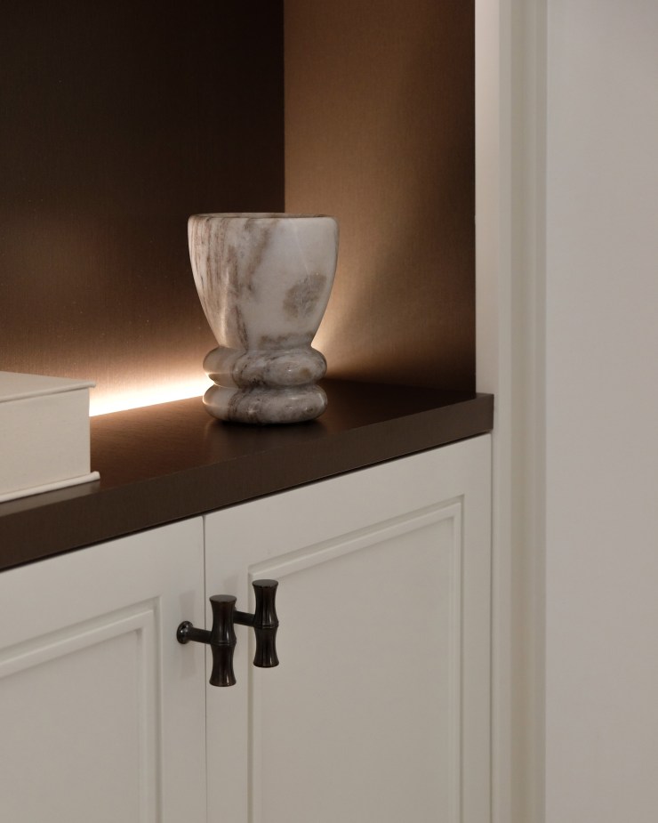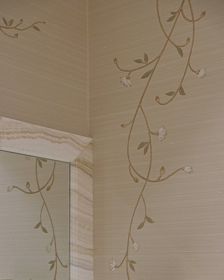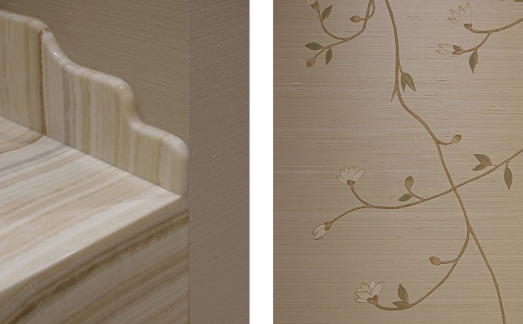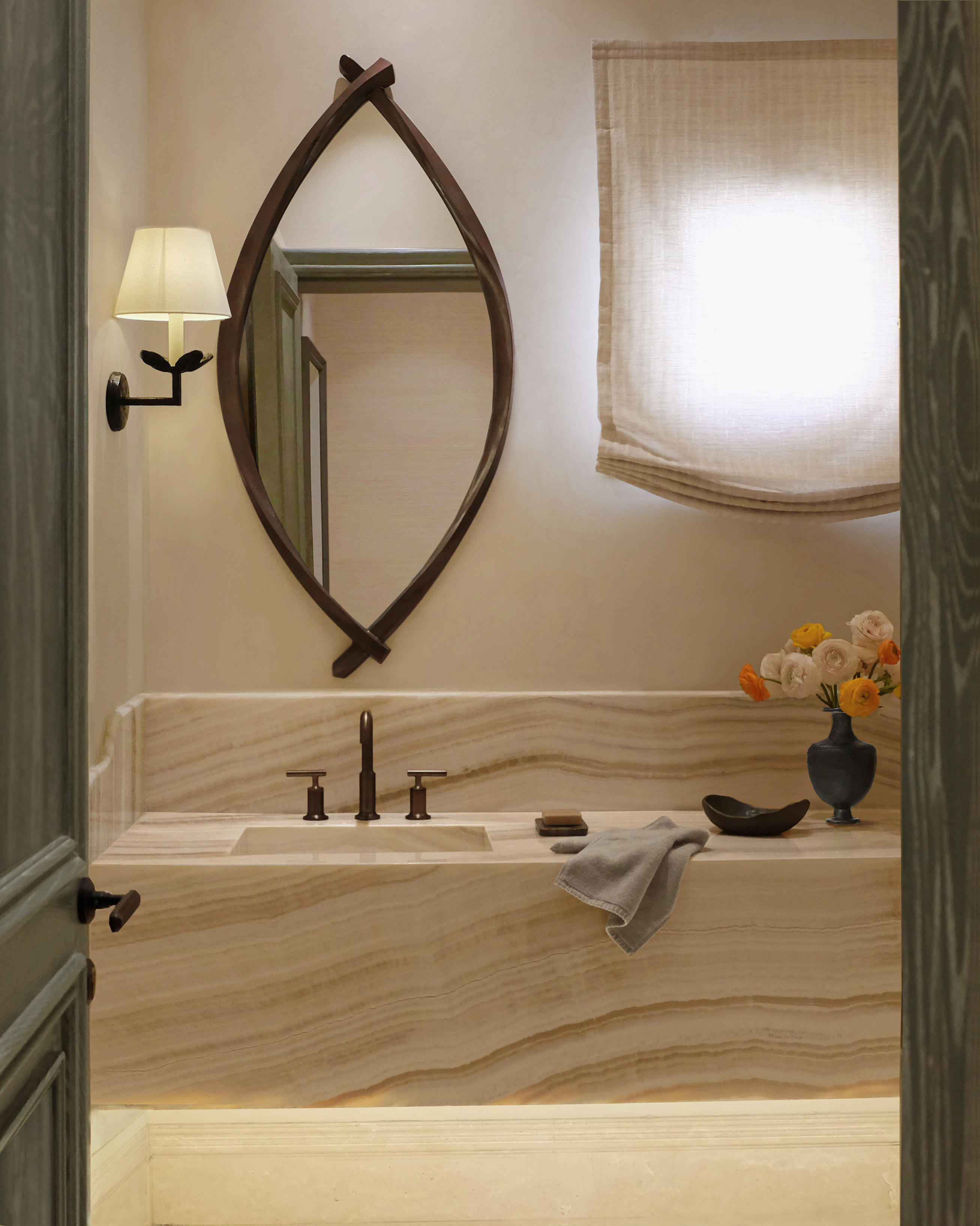 A subtle mood prevails in the majlis powder room. Moody plaster finish walls are juxtaposed with tiger onyx and dark bronze details. A hand-painted floral drawing on natural silk sets the mood in the hand wash area.